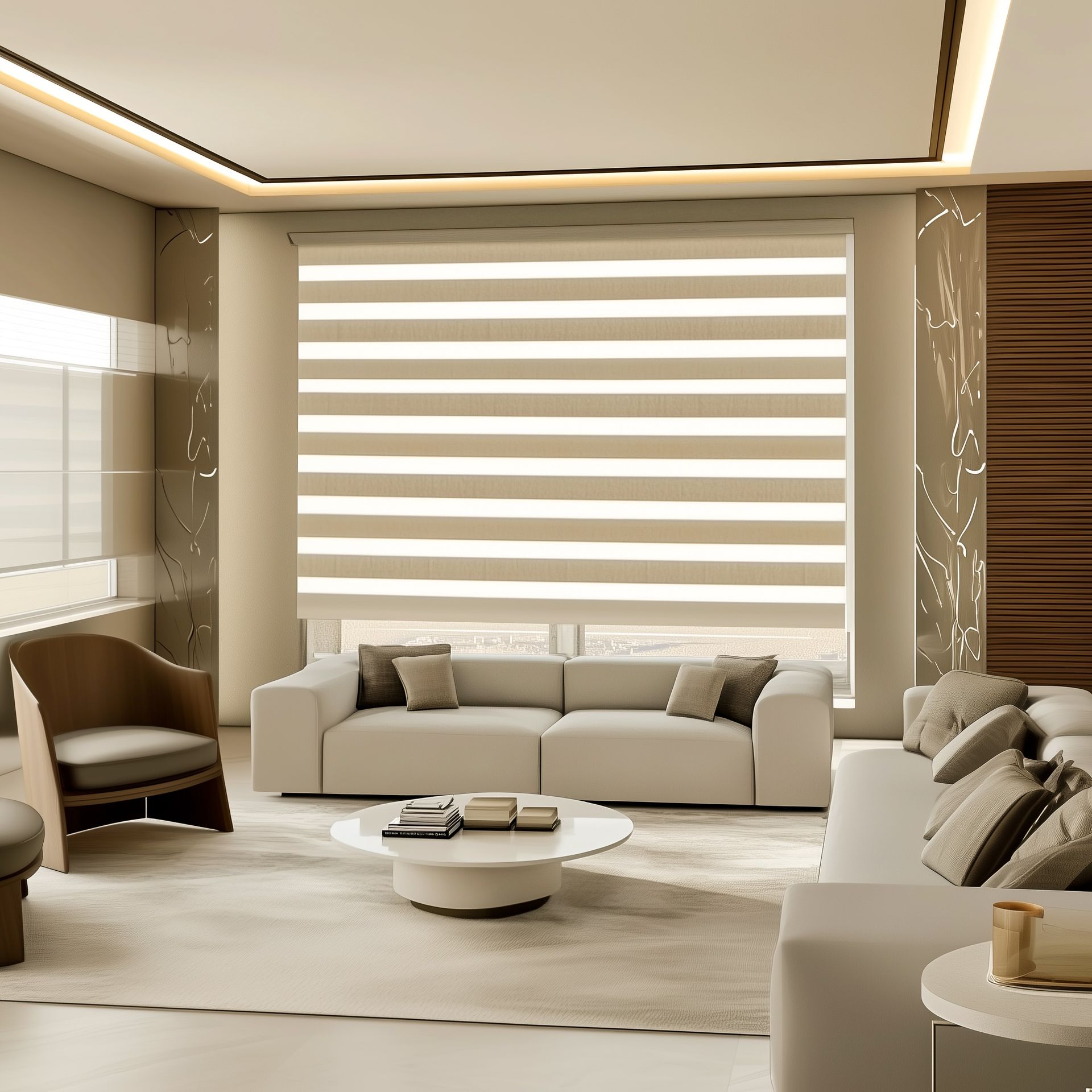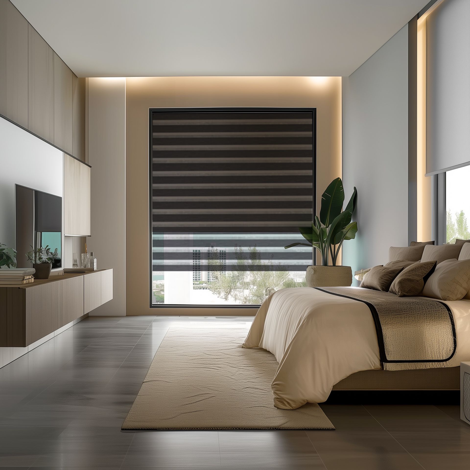 Esta opción es ideal para controlar la privacidad y la luz en tu espacio. Con el tejido en blackout, puedes disfrutar de una noche tranquila y privada, bloqueando completamente la luz del exterior. Por otro lado, la sheer screen permite mayor paso de la luz natural durante el día, creando un ambiente iluminado y acogedor gracias a sus franjas horizontales de diferentes densidades y transparencias.