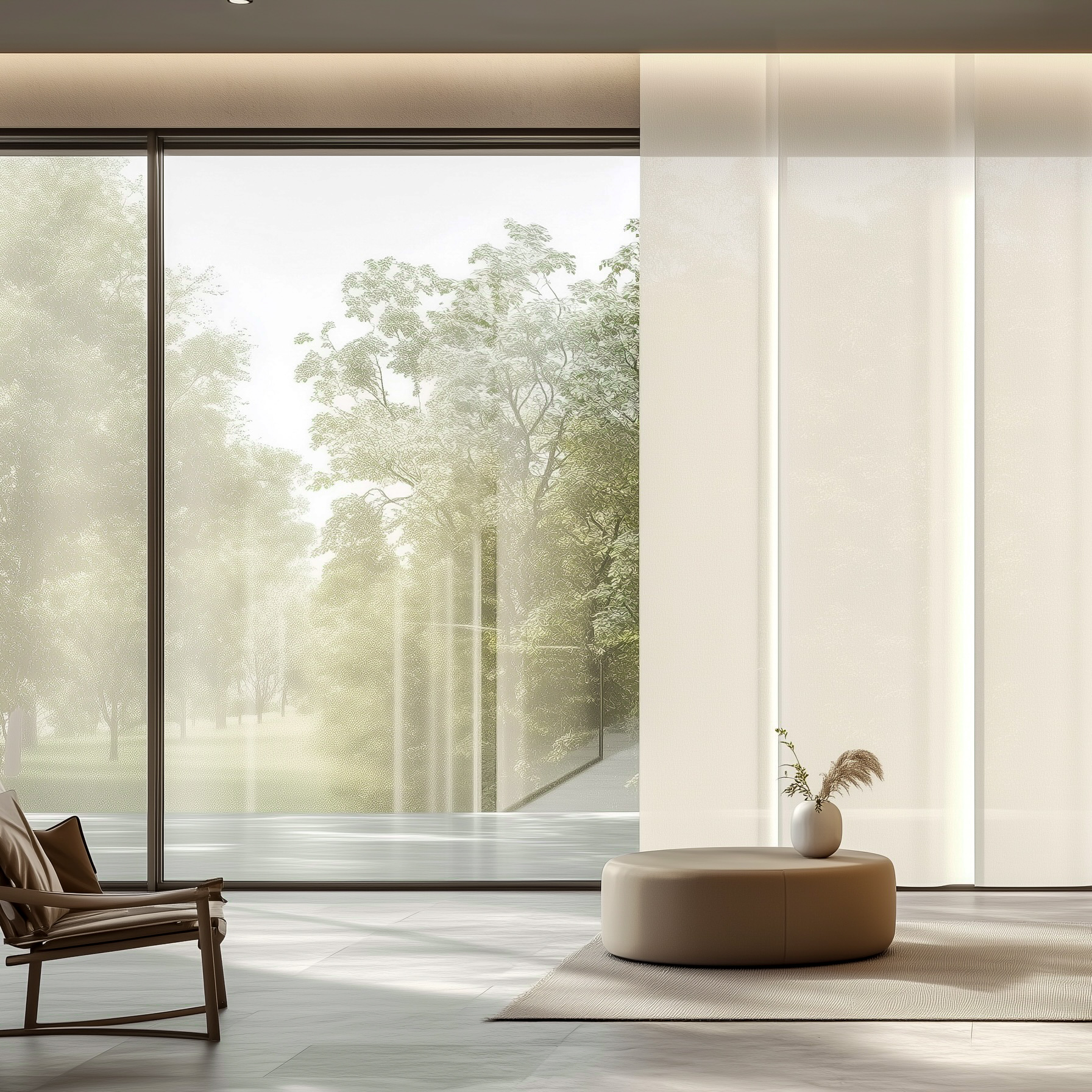 Las persianas tipo panel ofrecen un aspecto contemporáneo y elegante, ideales para ventanas grandes, puertas plegables o de patio, y perfectas para separar ambientes. Son duraderas y eficaces en el ahorro energético al reducir el deslumbramiento.